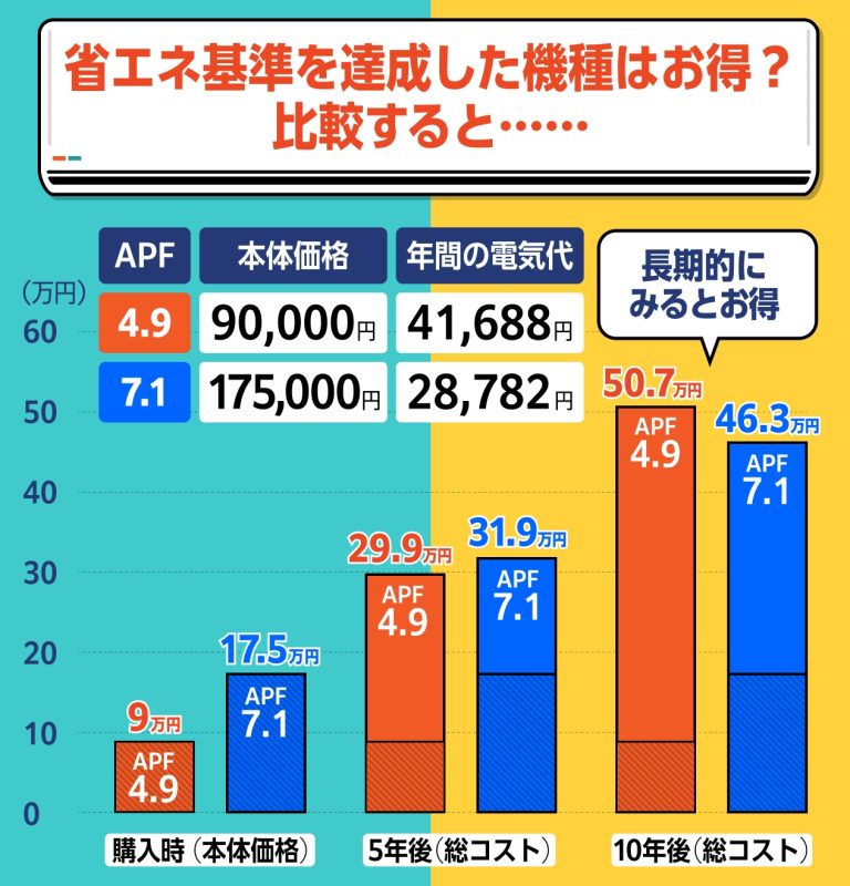 省エネ基準達成の上位機種APF7.1のエアコンを10年間使い続けると、