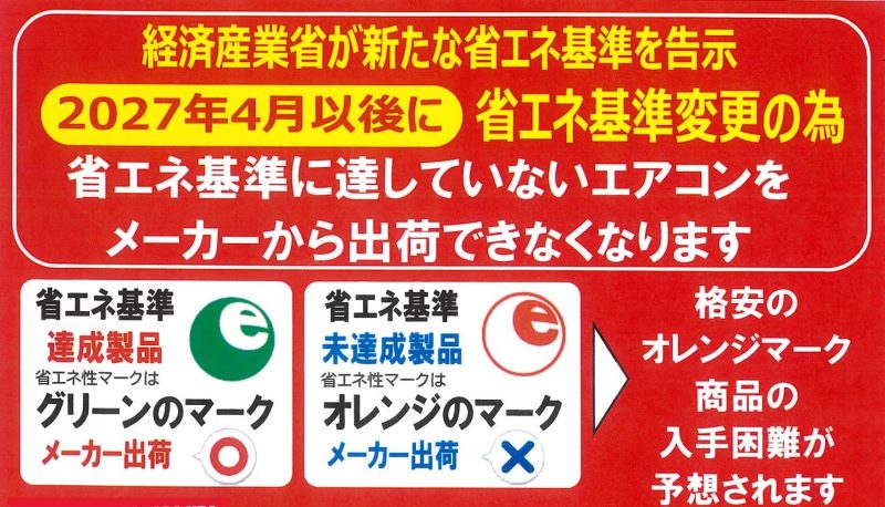 2027年度から、家庭用エアコンの省エネ基準が今より厳格化されることです