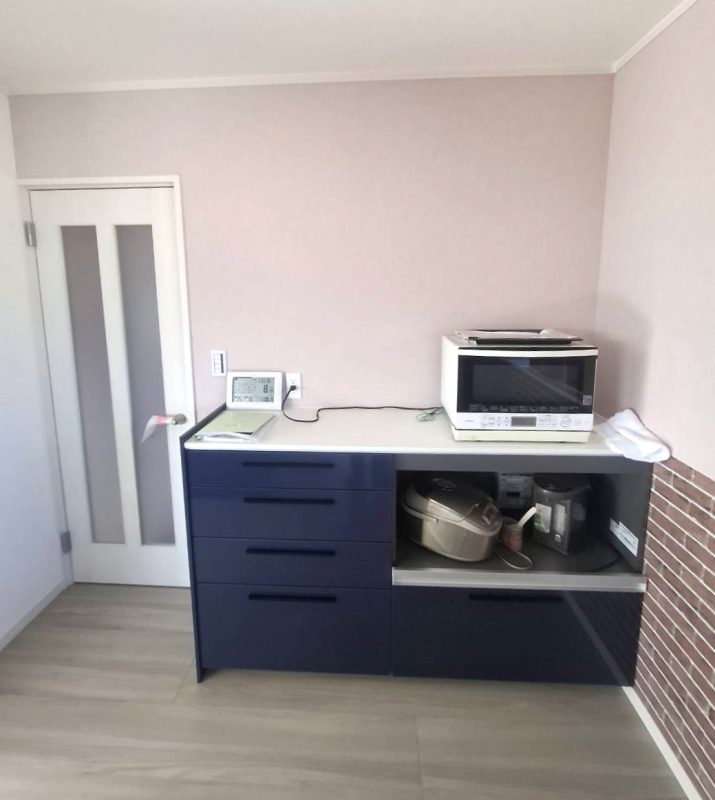 新設した壁部分に、キッチン扉カラーと揃えたカウンター家電収納を設置しました