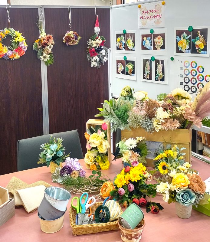 空くじなしの抽選でプレゼント、温かいクリームシチューとパンのセット、アートフラワー(造花)を使ったアレンジメント作成