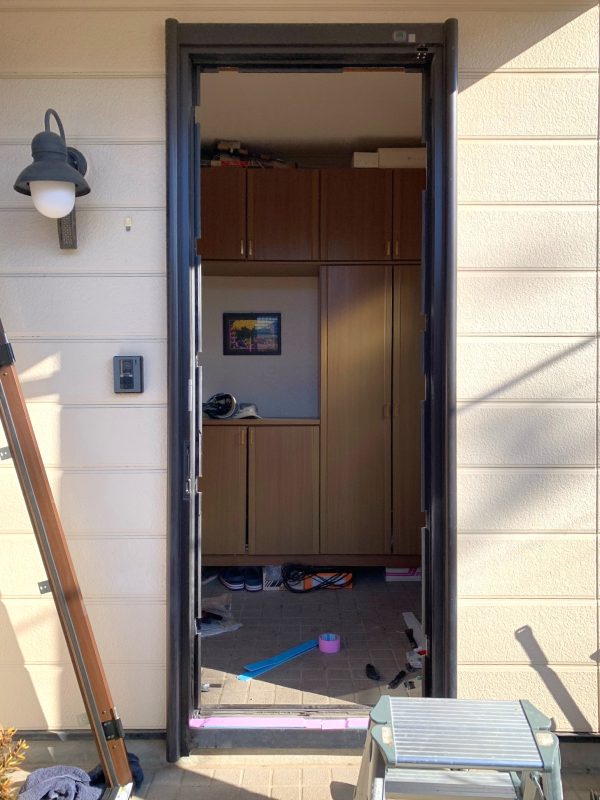既存のドア枠は残して玄関ドアだけを取り外したところに、かぶせる形で新しいドア枠を取り付けます