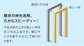玄関ドアを壁からドア枠も丸ごと取り外して交換する工事よりも、費用・工期ともに抑えることができます