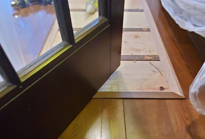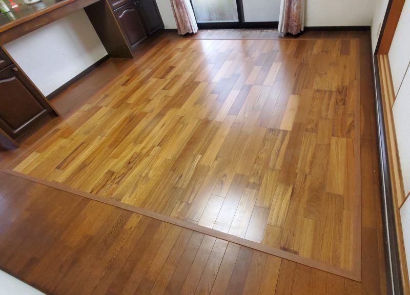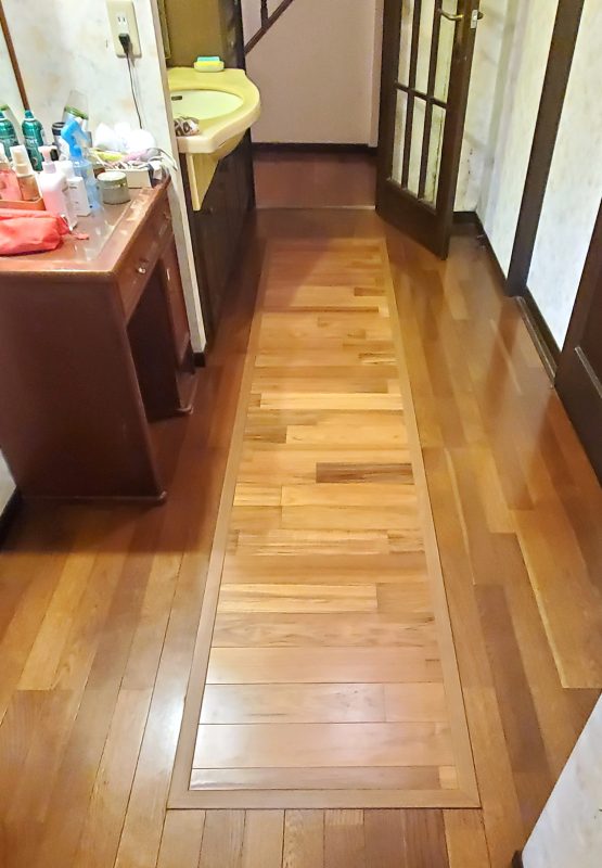 既存フローリングと床暖房施工部分の境目は見切り材で仕上げます