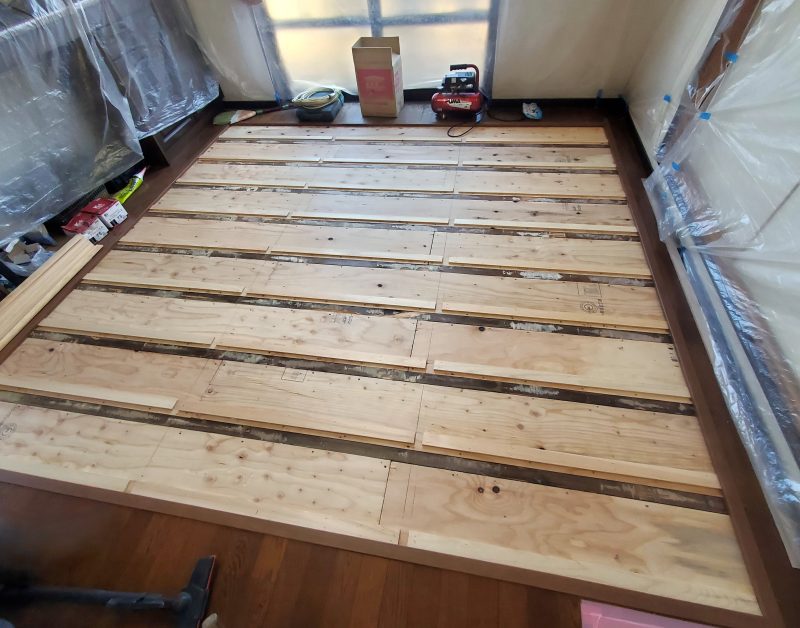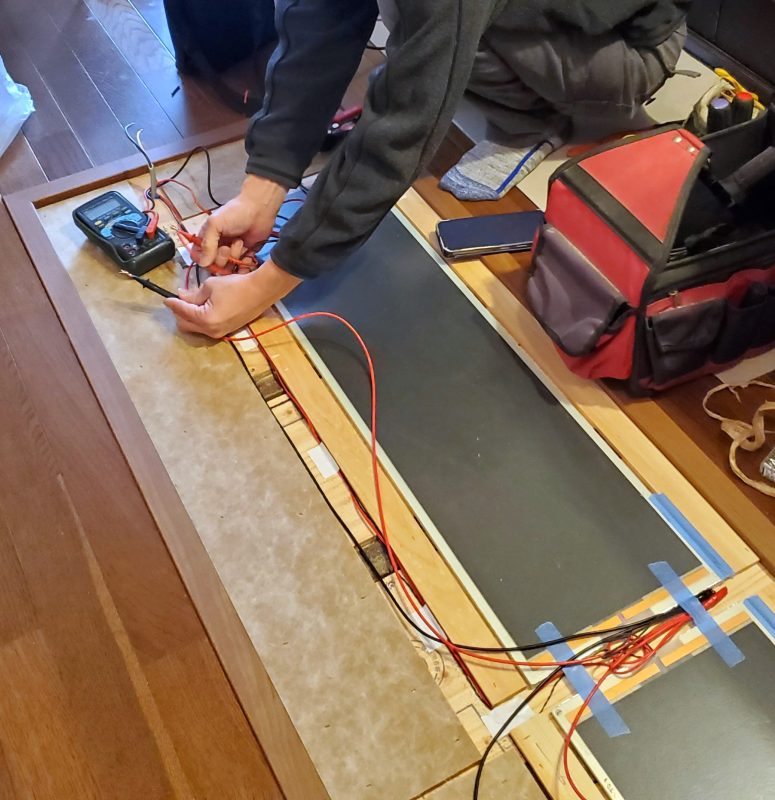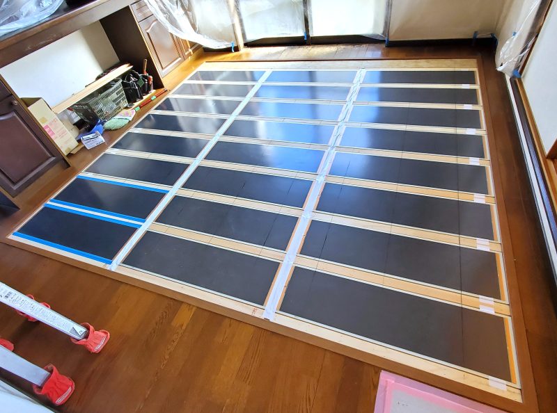 床暖房を施工する部分の既存フローリングを剥して、遠赤外線シートを敷き、配線をつないでいきます