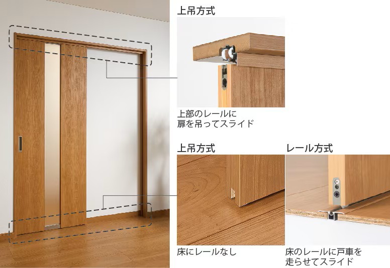 引き戸の上部のレールから扉を吊るして開閉する上吊りの方法があります