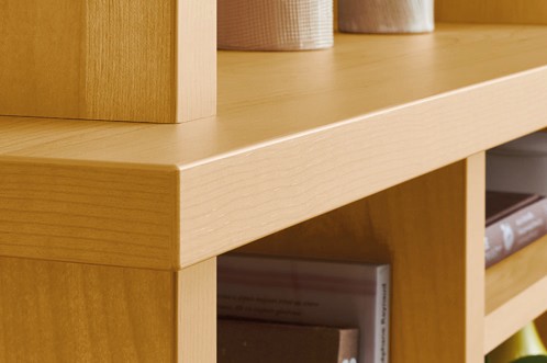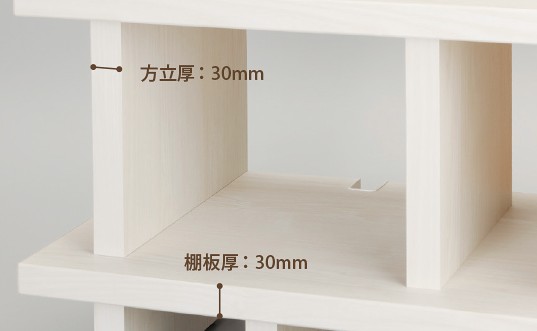 棚板、方立ともに厚みは30mmあり、木口は棚板と同色の木口材で一体感のある仕様