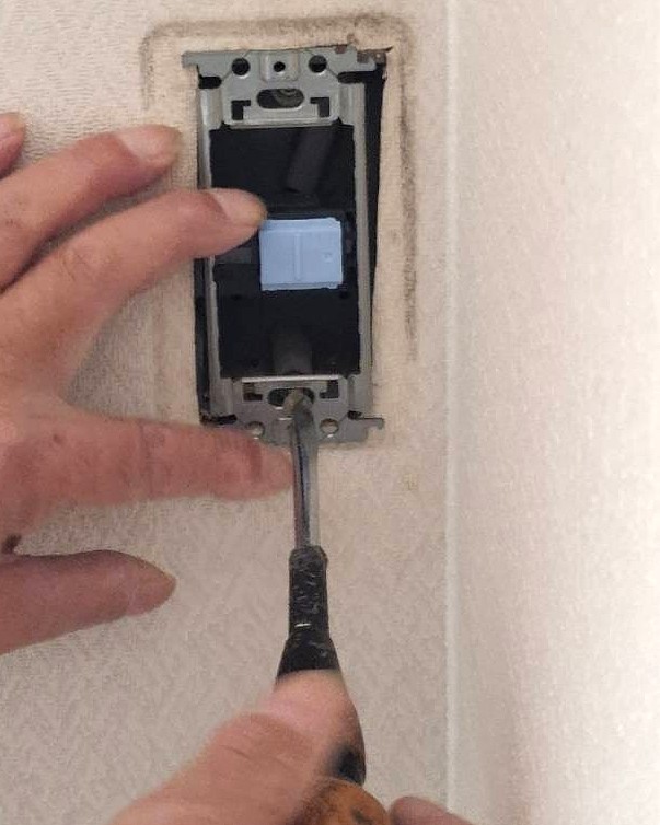 カバープレートと取付枠のネジを外し、スイッチ本体を壁から引き出します